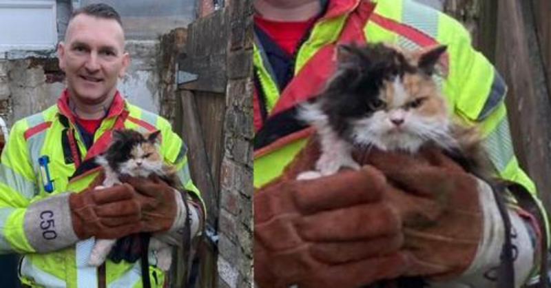 Firefighters save cat trapped between walls — grumpy cat doesn’t look happy about it