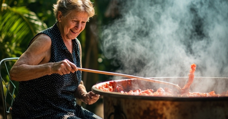She starts the tomato sauce before sunrise, same as always, stirring with that old wooden stick from the ’80s. Neighbors joke about her “witch’s cauldron,” but no one...