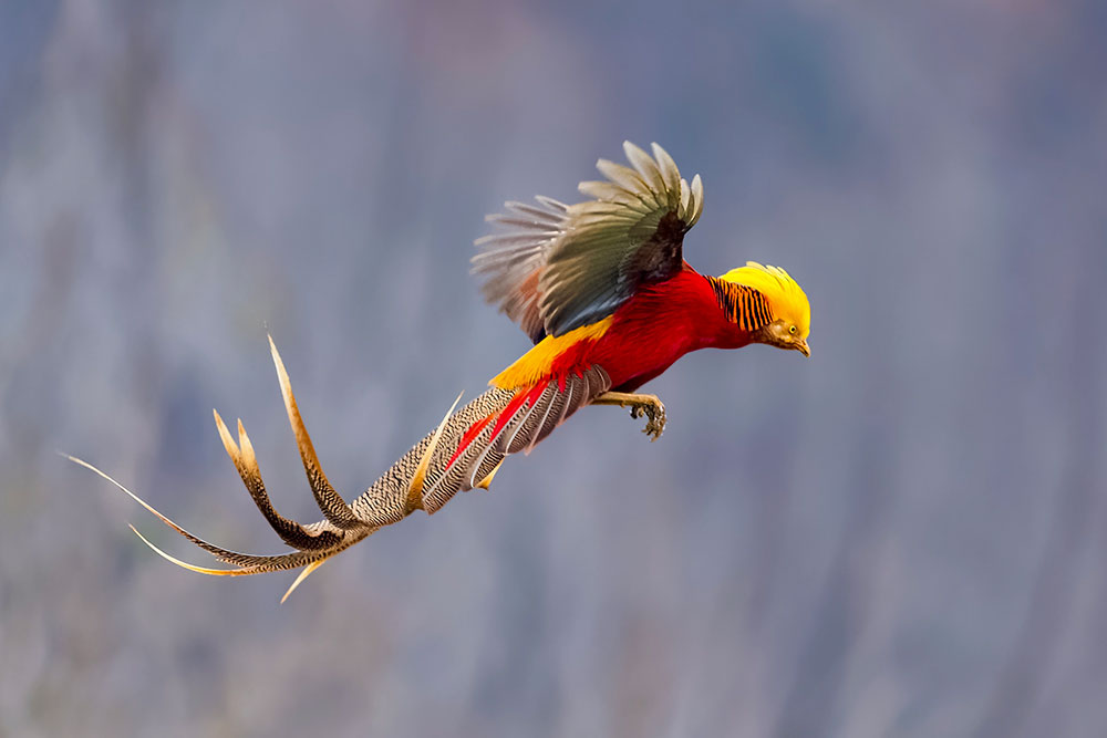 Discovering the Exquisite Charm of a Bird with its Vibrant Red Tail, Sunshine Yellow, and Fiery Orange Stripes!